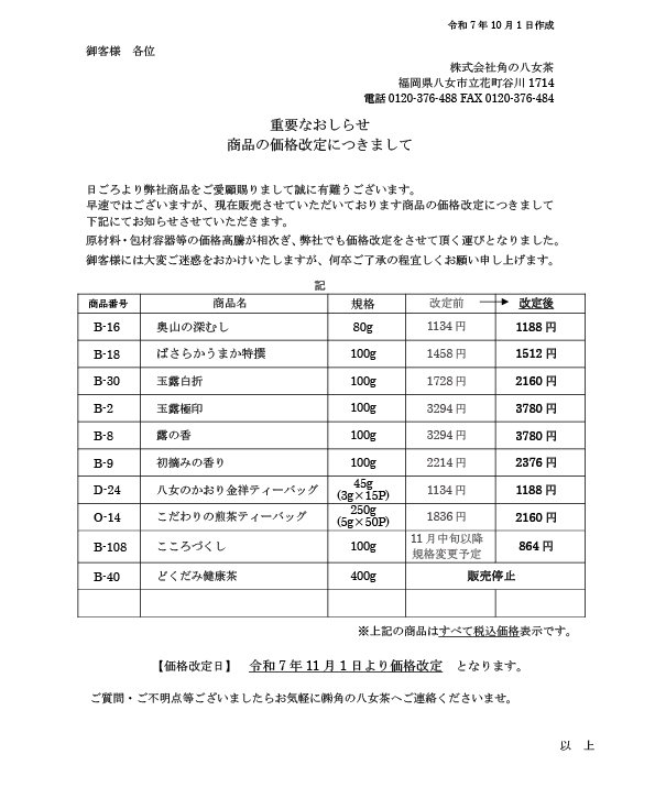早速ではございますが、令和7年5月1日より角の八女茶商品の価格を改定させていただきます。